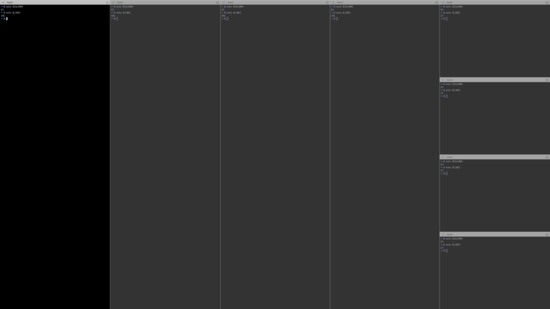 I like having lots of terminals side-by-side, to see many different things simultaneously. Most places I’ve worked have kept code to 80 columns, with two-space indentation, which is a good fit for my approach. Here’s how I usually have my terminals set up:
