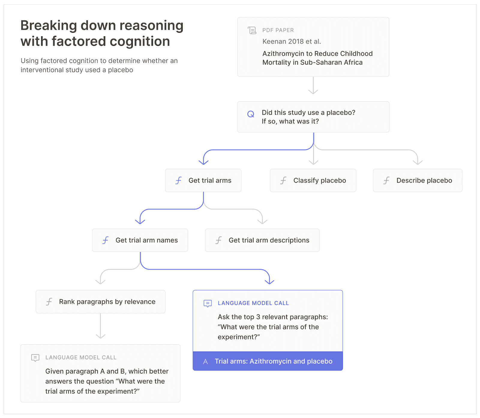 Source: Factored Cognition Primer. In the above figure, we illustrate the process of breaking down a complex research question concerning azithromycin into multiple sub-questions. These sub-questions are gradually simplified until they can be addressed through a single language model call.