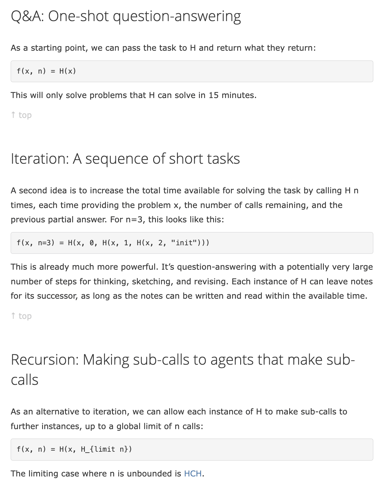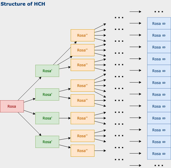 In section “Some amplification schemes”, we presented the recursion scheme and its limit Humans Consulting HCH (HCH): “Humans Consulting HCH (HCH) is a recursive acronym describing a setup where humans can consult simulations of themselves to help answer questions. It is a concept used in discussion of the iterated amplification proposal to solve the alignment problem”. Source: HCH.