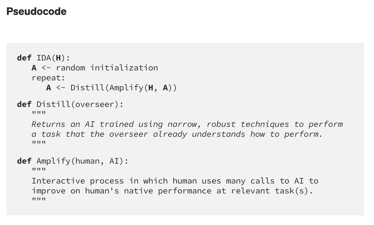 Iterated Amplification and Distillation (IDA) is an approach to train capable and safe AIs(Christiano et al., 2018) through a process of initially building weak aligned AIs, and recursively using each new AI to build a slightly smarter and still aligned AI. I also draw from Cotra’s (2018) perspective on iterated distillation and amplification.