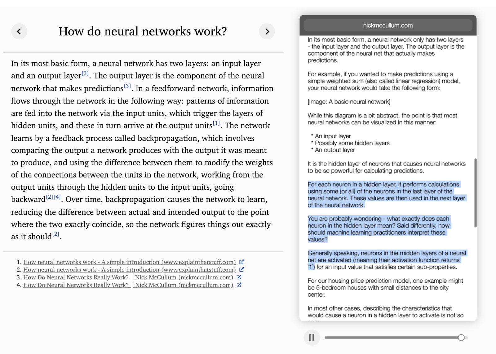 The system performs a search, navigates to a webpage, selects text, and iteratively composes its response while citing sources.