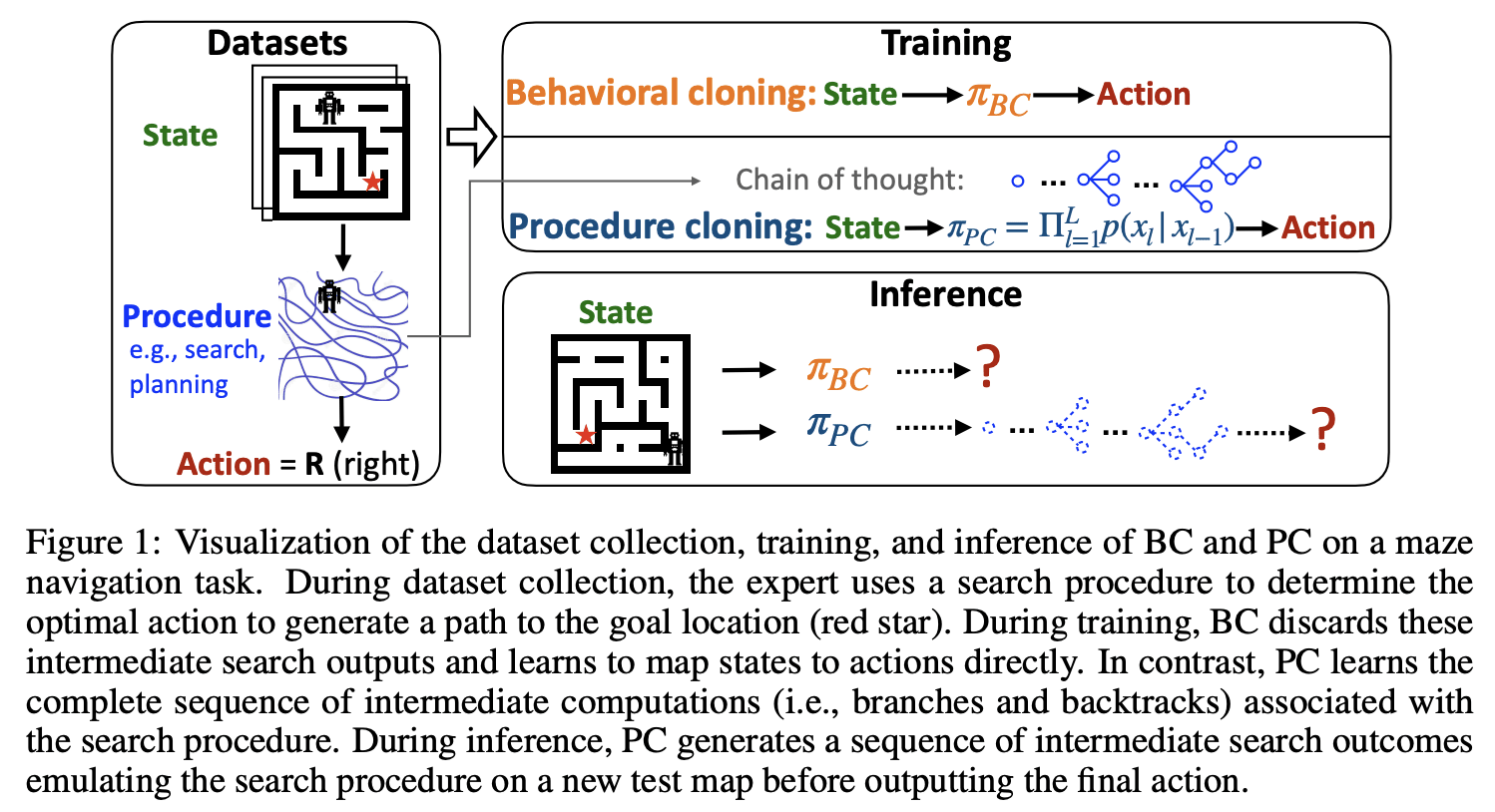 Procedure cloning, unlike its counterpart, behavioral cloning (BC), leverages supervised sequence prediction to replicate not just the final expert decision but the entire series of computations that led to this decision. In essence, procedure cloning doesn’t merely focus on the ‘what’ - the end action, but also pays attention to the ‘how’ and the ‘why’ - the underlying procedure.
