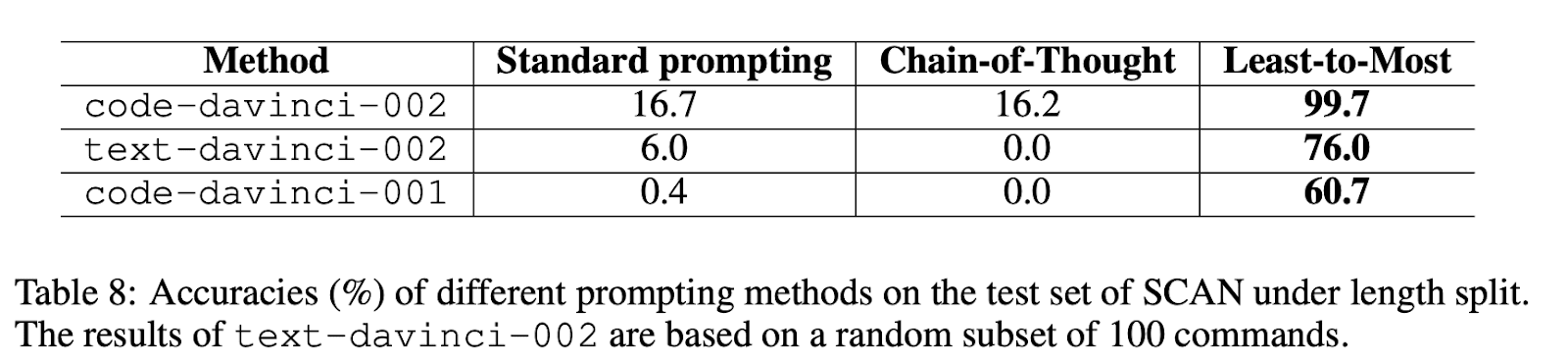 Results indicate that the Least-to-Most prompting technique can effectively solve problems in SCAN. GPT-3 goes from 16.2% with chain-of-thought to 99.7% with Least to Most prompting.