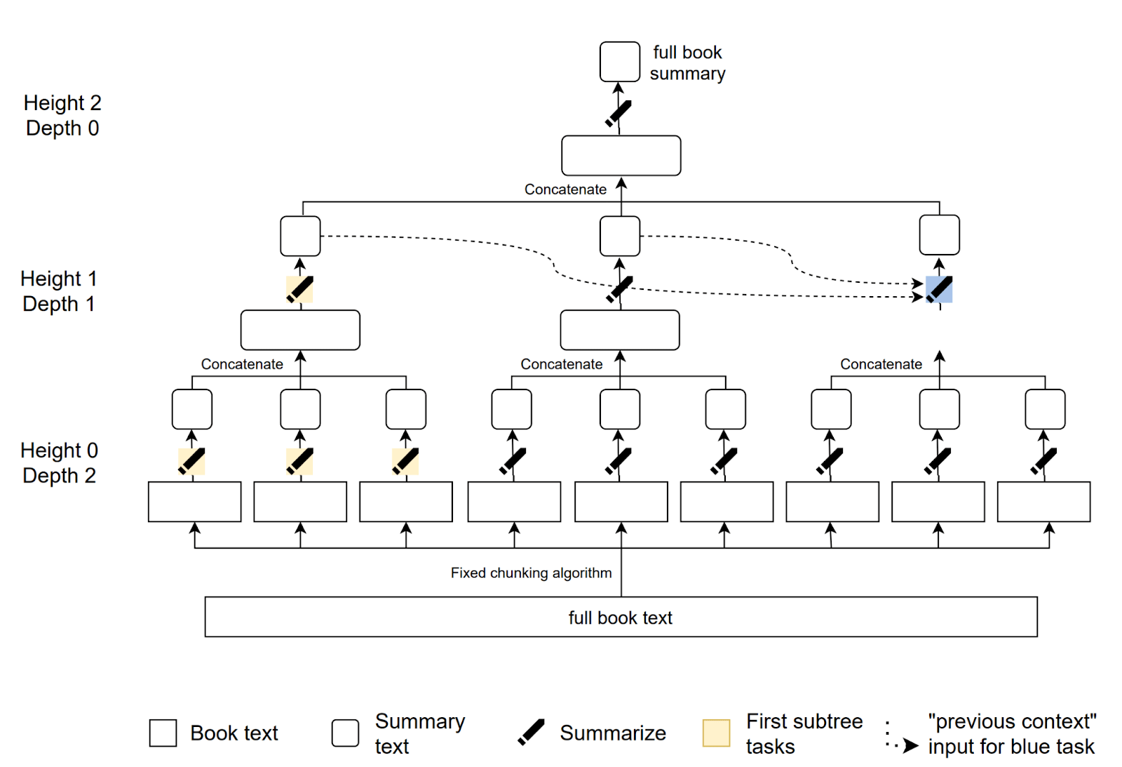 To summarize a book, a language model first summarizes each page individually. Then, these individual summaries are combined, and the resulting concatenated summary is further summarized. This process continues until a summary of the entire book is generated.