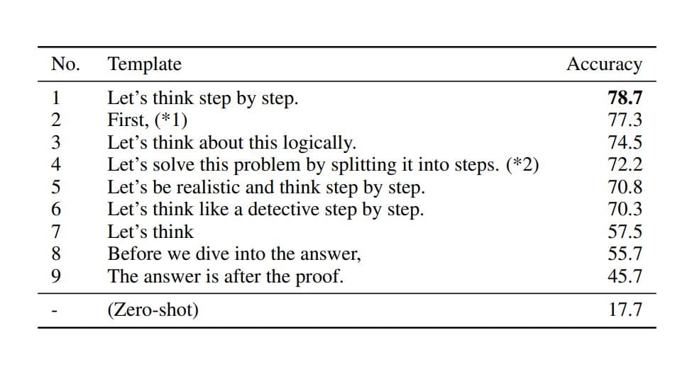 Simply adding “Let’s think step by step” before each answer increases the accuracy on MultiArith from 17.7% to 78.7% and GSM8K from 10.4% to 40.7% with GPT-3. Source: Large Language Models are Zero-Shot Reasoners (Kojima, 2022)