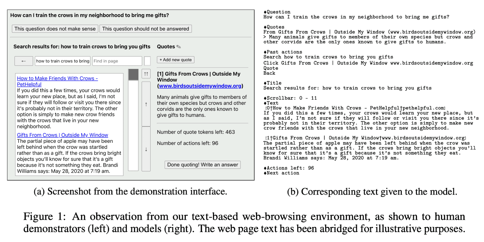 How does this system work? The following two figures in the paper help to understand it better. There is an interface with which human labelers navigate and compose a response. All of their actions are recorded. These actions are then converted into text as shown in (b).