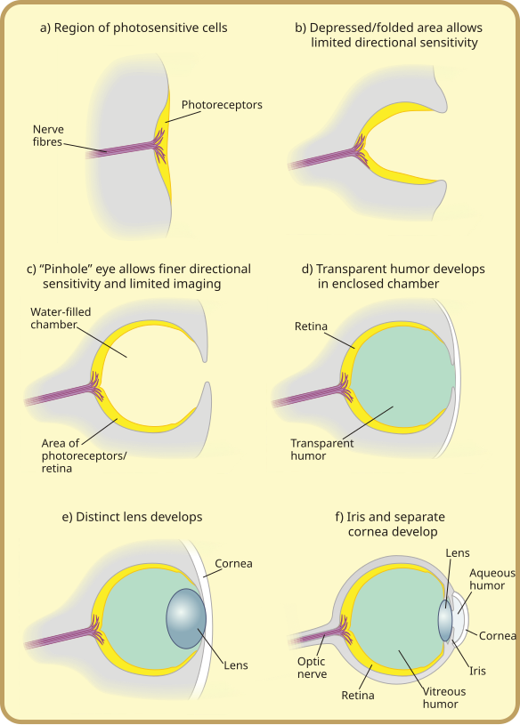 I think there is, and the reason harks back to the way that eyes often evolve. It doesn’t start with a complex eye with lenses. It starts with a patch of skin that’s sensitive to light. A simple “0” or “1″ input. If that input turns out to be useful, future generations might propagate that mutation and a more complex light detecting system with nerves going to different patches in a concave well that acts like a pinhole camera: