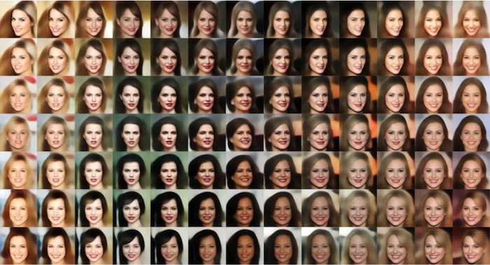 Figure 1: Generalizing semantic embeddings. Images corresponding to points in a two-dimensional grid in a high-dimensional space of face embeddings. Using text to describe faces and their differences in a high-dimensional face-space (typical dimensionalities are on the rough order of 100) would be difficult, and we can expect a similar gap in expressive capacity between embeddings and text in semantic domains where rich denotations cannot be so readily visualized or (of course) described. Image from Deep Learning with Python (2021).