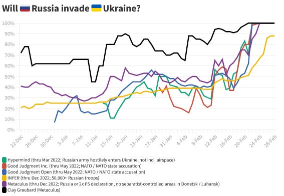 The large-scale Russian invasion into Ukraine provides an interesting model of how governments, pundits, prediction markets, and the common folks would predict an imminent global catastrophe.