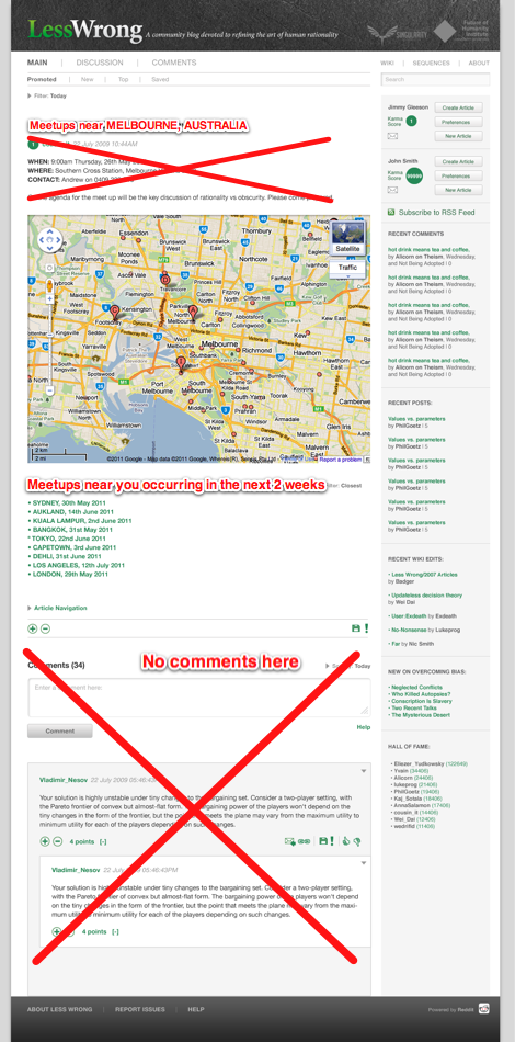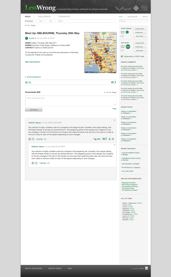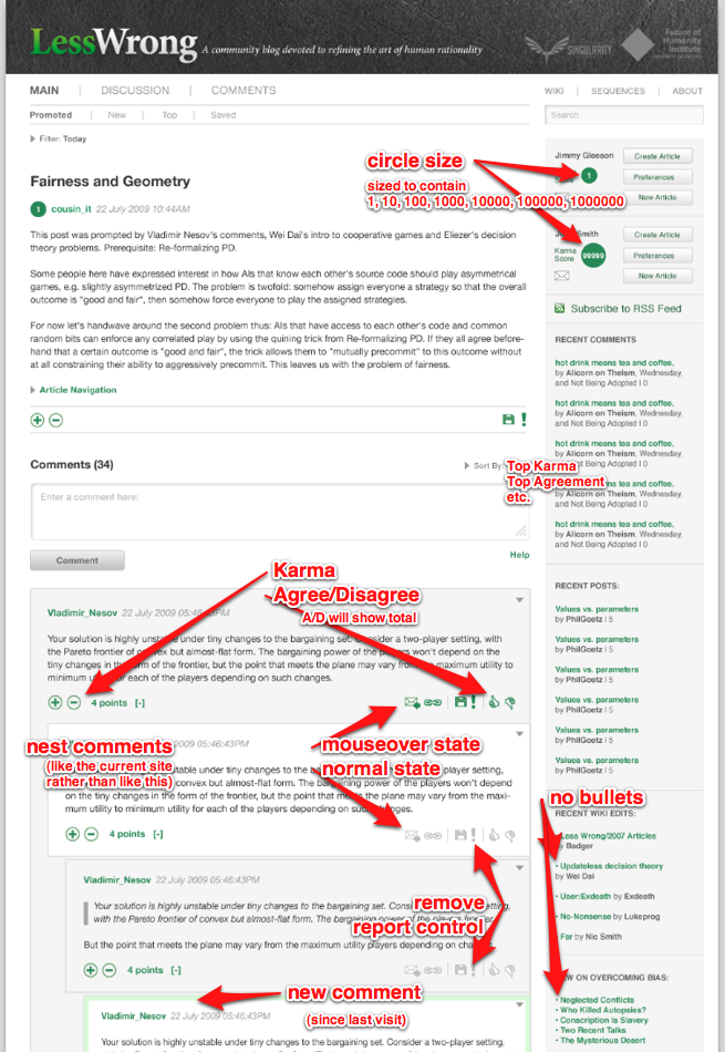And finally, a few nitpicks with which you may or may not agree. The bullets on the sidebar probably shouldn’t sometimes be green, the Hall of Fame list is too far right, the Recent Posts and Recent Comments boxes should be shifted one bullet-width right to align with the other boxes even if they don’t have bullets so that they’re aligned. The space between the article title and the header image has a bit too much padding in general. The ‘report’ exclamation point should have its top and bottom aligned with the ‘save’ icon. The unbolded-green karma scores in the Hall of Fame are a font-color-boldness combination that doesn’t appear anywhere else, and it seems weird (why would the score be a link but not the name? Or is it?).