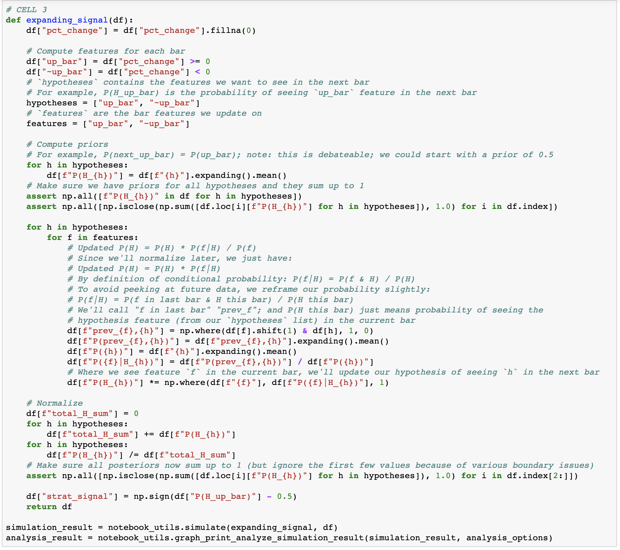 Currently we’re computing the prior for P(next bar is up) by assuming that it’ll essentially draw from the same distribution as the last N bars. We could also say that we just don’t know! The market is really clever, and on priors we just shouldn’t assume we know anything: P(next bar is up) = 50%.