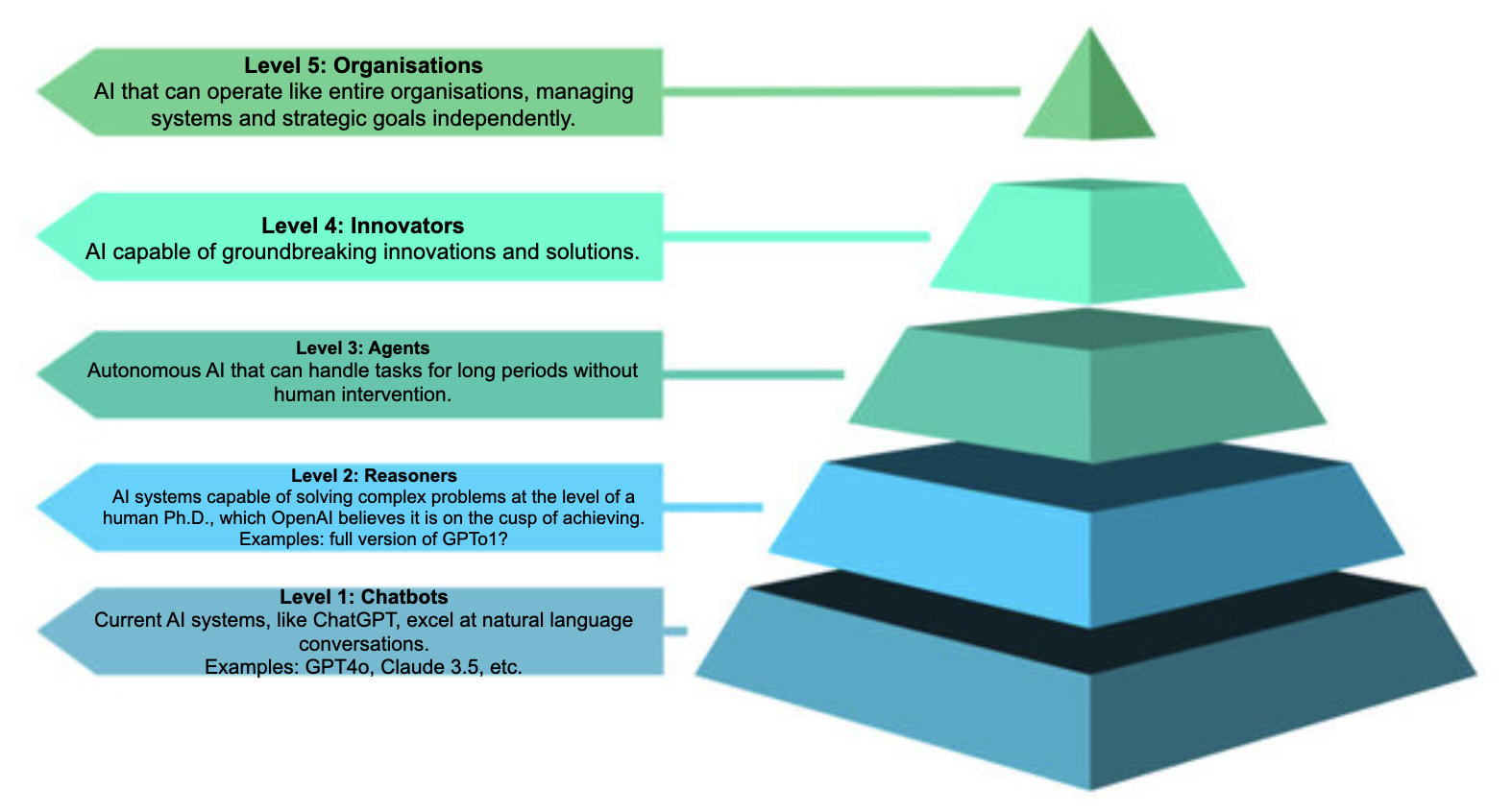 Further adding to the expectation, excitement and ‘hype’ around agentic AI was the (now somewhat infamous) Bloomberg report from 11th July of this year regarding OpenAI’s internal roadmap toward AGI[9]. This article suggested executives at the company had defined five ‘levels’ of artificial intelligence, with Level 5 (‘organisations’), being the topmost, and, in the interpretations of some speculators, a stepping stone towards artificial general intelligence (AGI).[10] In this hierarchy, existing products such as ChatGPT, Claude, Llama (etc.) would correspond broadly to Level 1 (Chatbots), with new models such as GPTo1 potentially edging more into the territory of Level 2 (Reasoner). At Level 3 we find ‘Agents’, the next milestone. Agentic AI at Level 3 operates autonomously, over long time frames and without the need for significant user oversight.