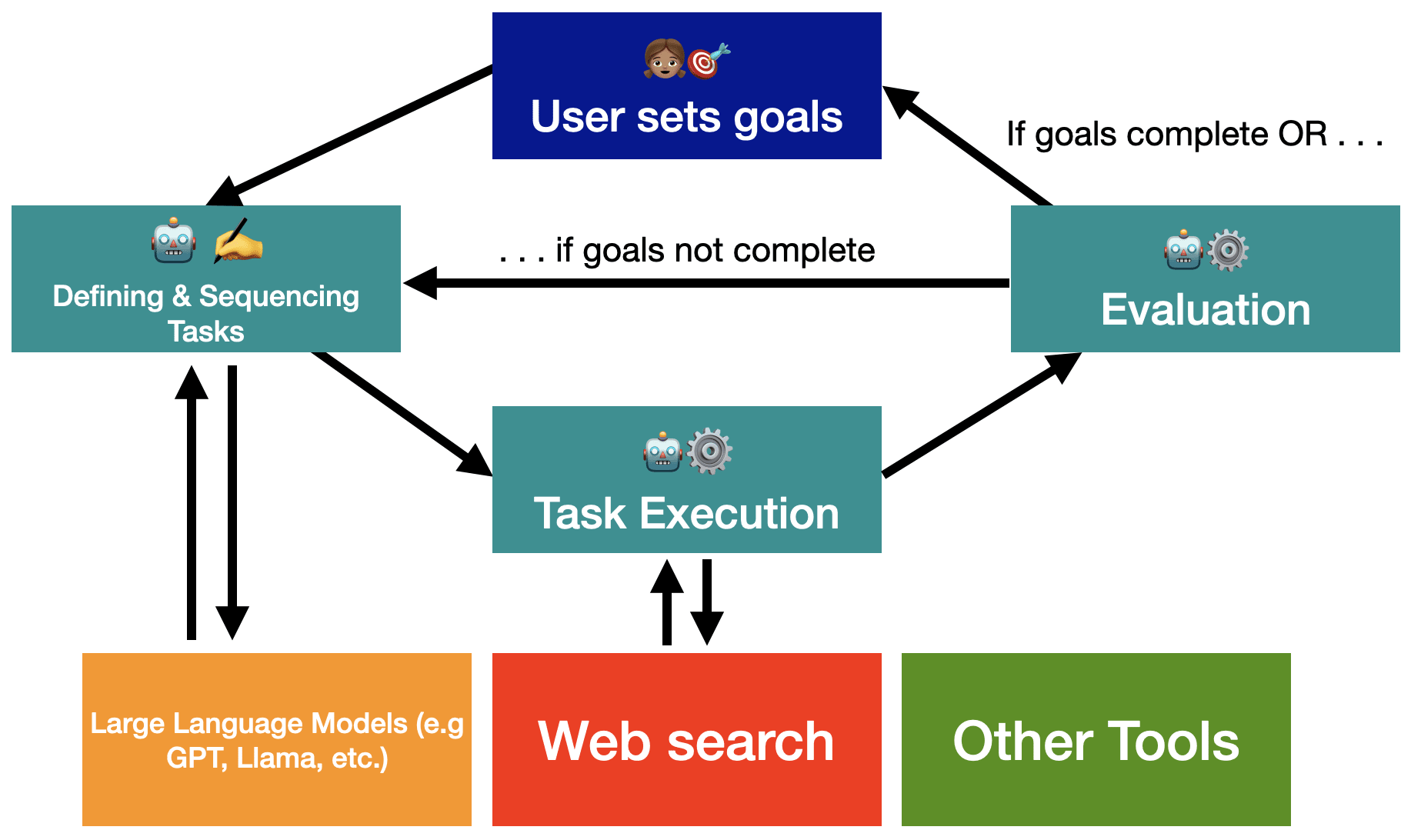 While there is some variation between agentic systems’ architecture, those like AutoGPT that are intended to function as general-purpose ‘assistants’ typically have agentic components to define the tasks arise from decomposing a goal, sequence them, execute them using API calls to one or more LLMs, tools such as web search to provide additional inputs and some means of evaluating the outputs that are returned. [41]If the evaluation suggests the goal has not been achieved, the process can then repeat an arbitrary number of times.