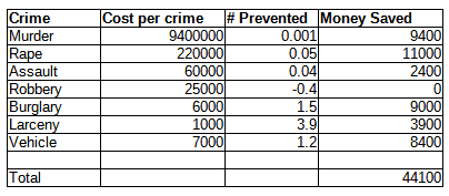 So yeah, I find these estimates here rather absurdly low. If we value a life at $12 million when calculating health care interventions, you’re telling me marginal murders only have a social cost of $9.4 million? That’s crazy, murder is considered much worse than other deaths and tends to happen to the young. I think you have to at least double the general life value.