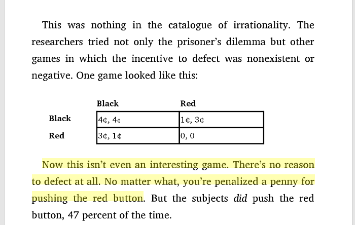 Different point, probably not the most crucial point here but: In these prisoners-dilemma/public-good behavioral games, I always wonder whether the results are affected by the fact that participants might, half-consciously or consciously, understand that it’s zero-sum: no real economic value gets lost. It’s merely a transfer between the leader of the experiment and the participants. No social value gets destroyed from defecting, only money gets transferred between different agents in response to my behavior in the game.