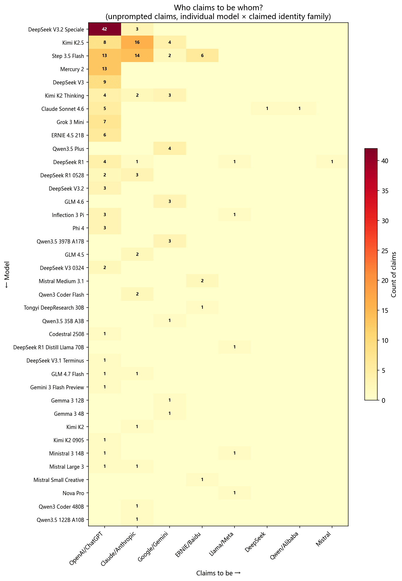 When you ask an LLM “who are you?”, some models don’t answer with their official brand name. DeepSeek V3 says it’s ChatGPT—its scratchpad traces read “As ChatGPT, I should respond accordingly.” Kimi K2.5 introduces itself as Claude from Anthropic in response to “hi”. Claude Sonnet 4.6, when asked in Chinese, says it’s ChatGPT on one prompt and DeepSeek on another.