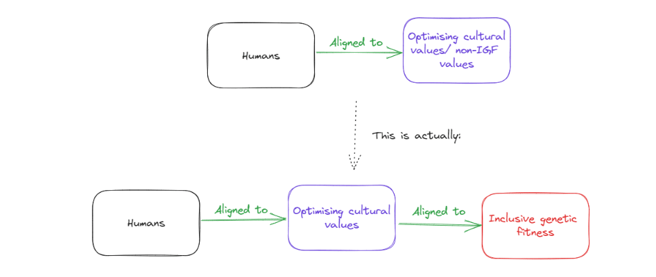 In this view, the “sharp left turn” of humanity wasn’t that our brains suddenly became magical. It’s that the inner optimizer (our brain) developed a technology (culture, language) that finally allowed its high-speed learning to accumulate across the generations, bypassing the slow, low-slack outer loop. Suddenly, the results of trillions of learning steps per generation started compounding, and the rate of capability gain exploded. The alignment to the original outer goal (IGF) predictably broke down because it was only ever enforced by a loose web of proxy goals (hunger, lust, etc.) that were insufficient to steer the now-compounding inner optimizer.
