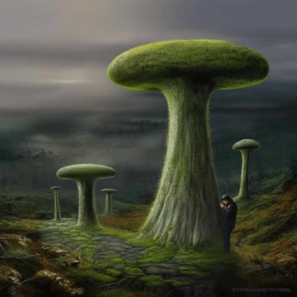 Figure 6: A depiction of a counterfactual species of moss growing on symbiotic giant fungi, generated with midjourney. This illustrates that, had vascular plants not evolved, plants might have grown tall not by developing their own supporting structures, but instead by symbiotically associating themselves with fungi that grow tall.[11]
