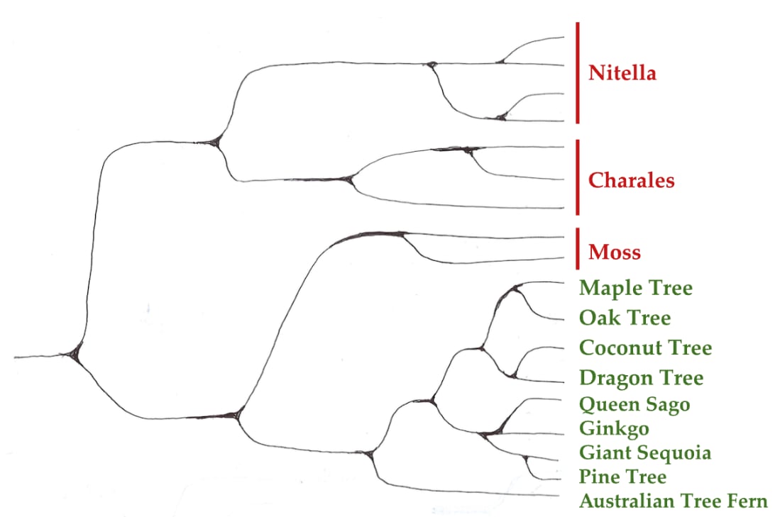 Figure 2a: What we would expect the phylogenetic tree of plants to look like if trees evolved once, and then spread across the world