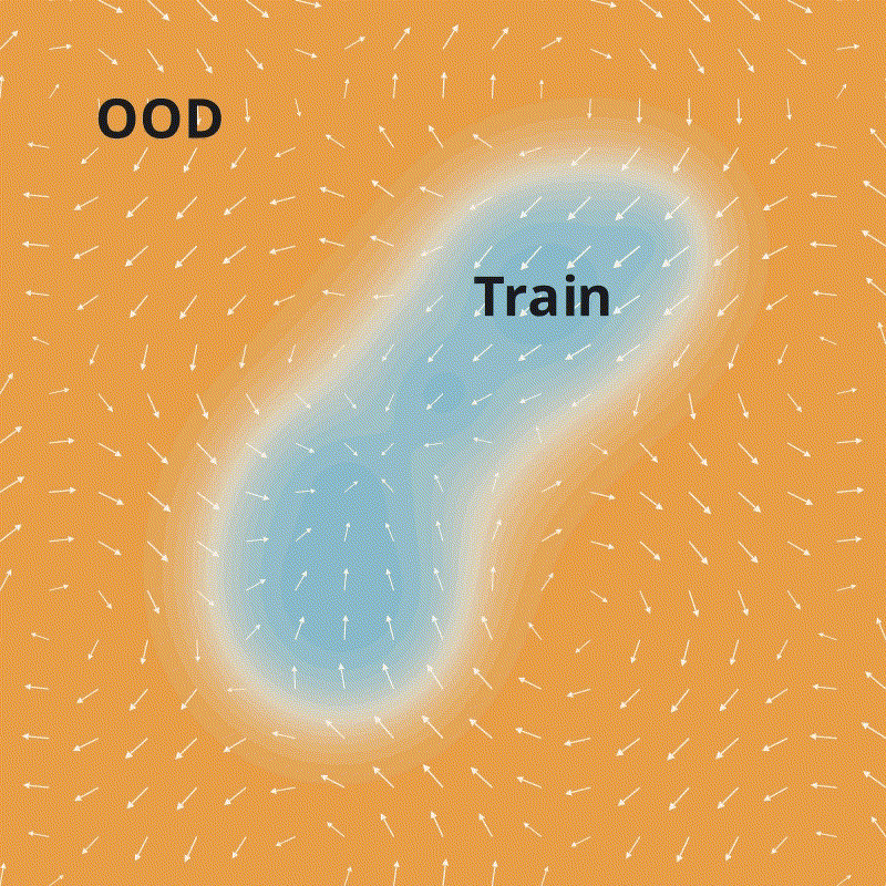 The gif above illustrates what might happen to the decision vector field of an agent after training. The moving lines represent the flow. The flow shows trajectories an agent would follow in the state space in absence of other forces. In the training region in blue, the agent learns to react optimally to the current context toward a particular objective. That makes this training region conservative, meaning this region is the gradient of a scalar function. The agent effectively optimizes this scalar function as long as it remains in the training region. Outside of the training region (OOD), the agent never visited these states before, by definition. Depending on how much the agent is able to infer of these unknown states from the known training states, the agent might behave completely differently in this OOD region. In the illustration above, the agent might desire to perform action that would essentially make it run around in circles if nothing else acts on the current state, making its preferences appear incoherent in these states. Note that this region shows non-conservativeness to emphasize how the “preference incoherency” might appear, but in general the action field might be random or quasi-null.