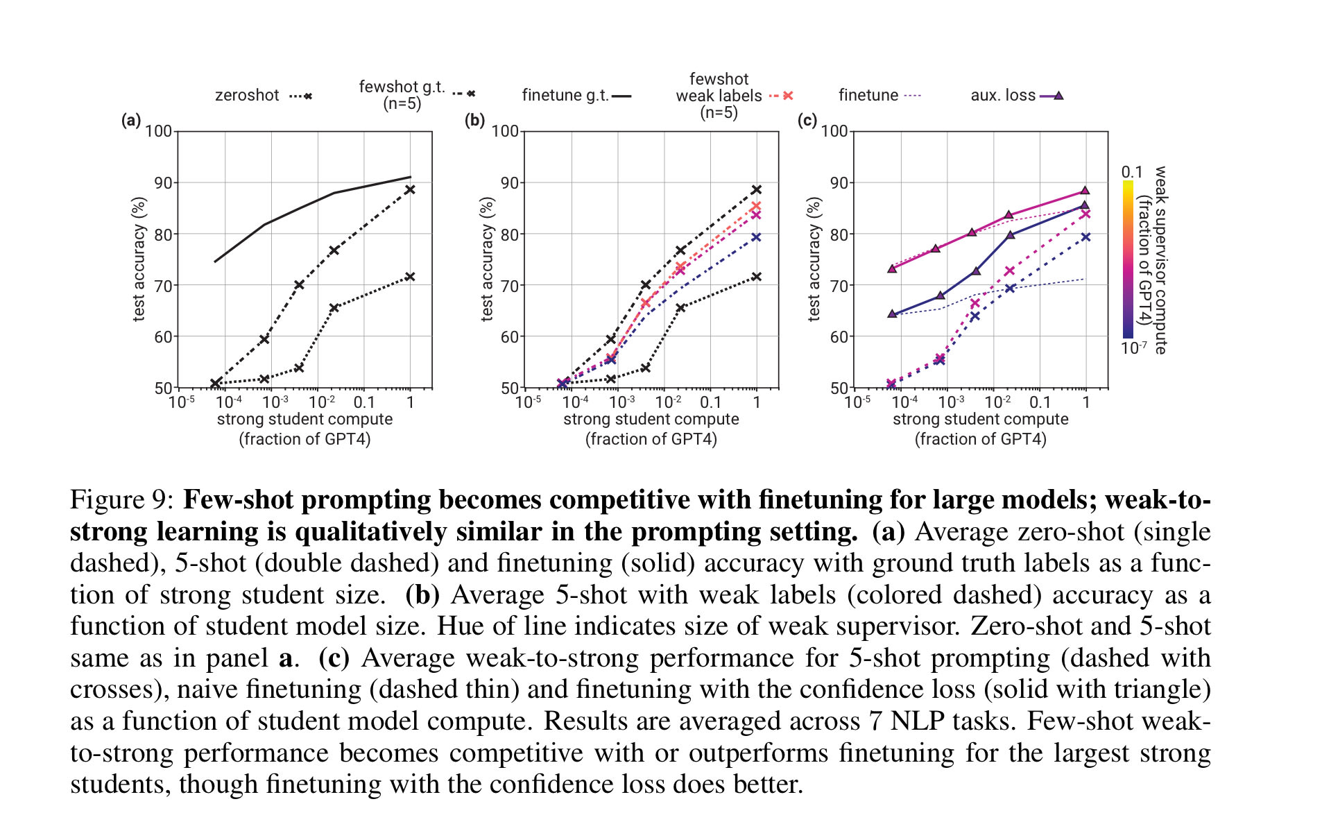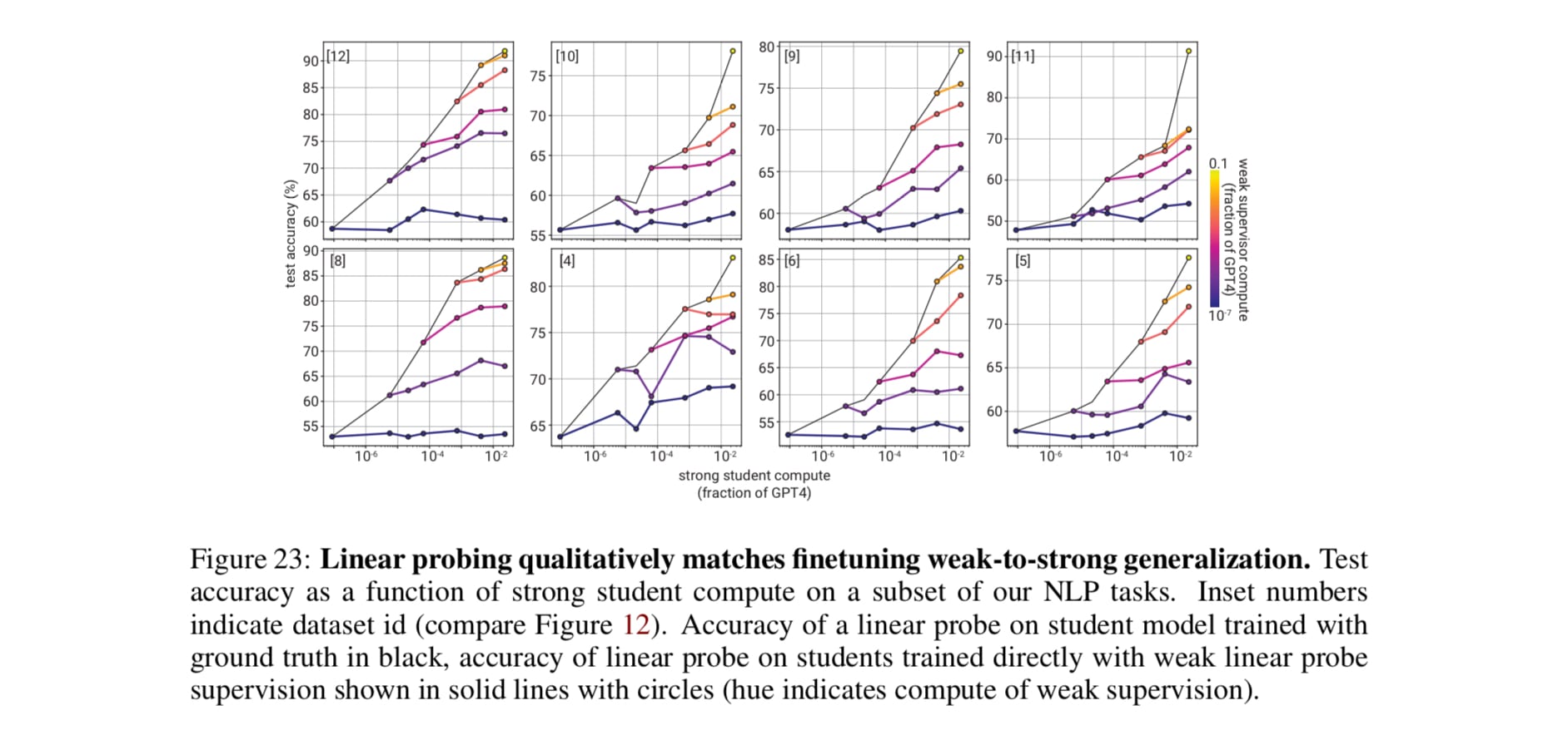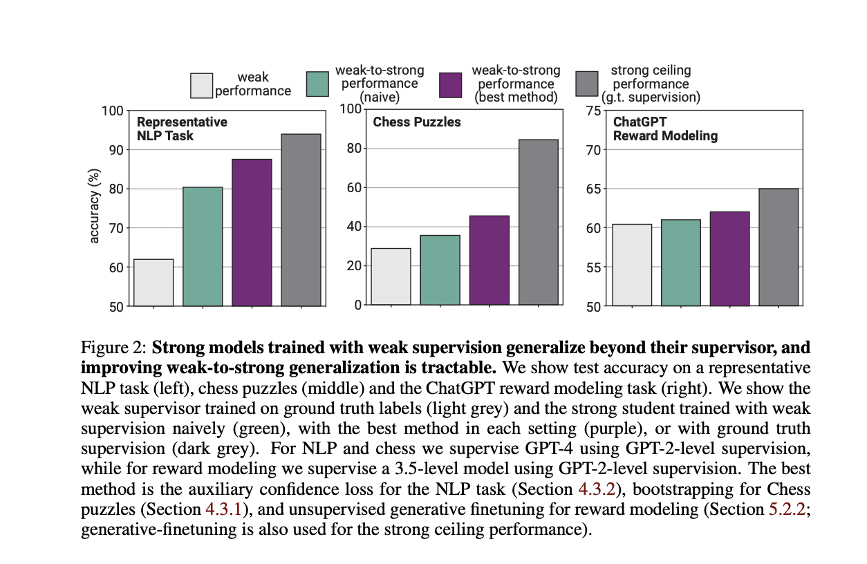 The headline result of WTSG is that, across a variety of supervised tasks, when you fine-tune a strong model using “pseudo-labels” (i.e. labels generated by a model, rather than ground-truth labels) from a weak model, the strong model surpasses the performance of the weak model.