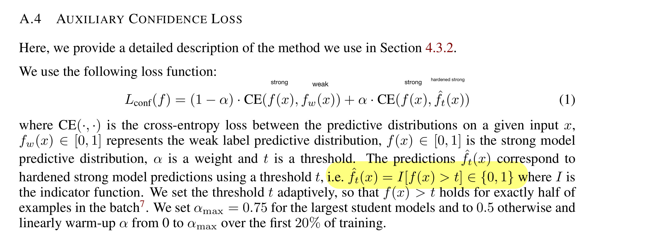 A: That’s the “auxiliary confidence loss” that the authors discovered improved weak-to-strong generalization in many domains. It tells the model to be more confident, and “reduces imitation of supervisor mistakes.” (pg. 13)