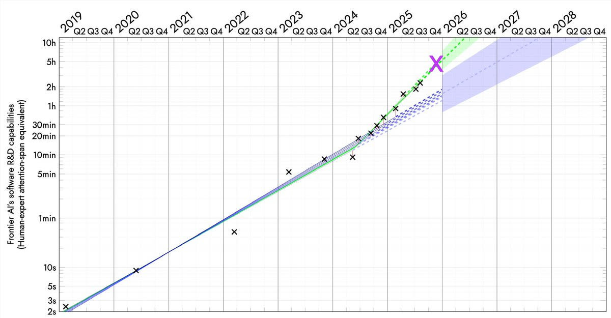 Davidad: yeah, I would guess that by December 2026 the RSI loop on algorithms will probably be closed, resulting in another inflection point to an even faster pace, perhaps around 70-80 day doubling time.