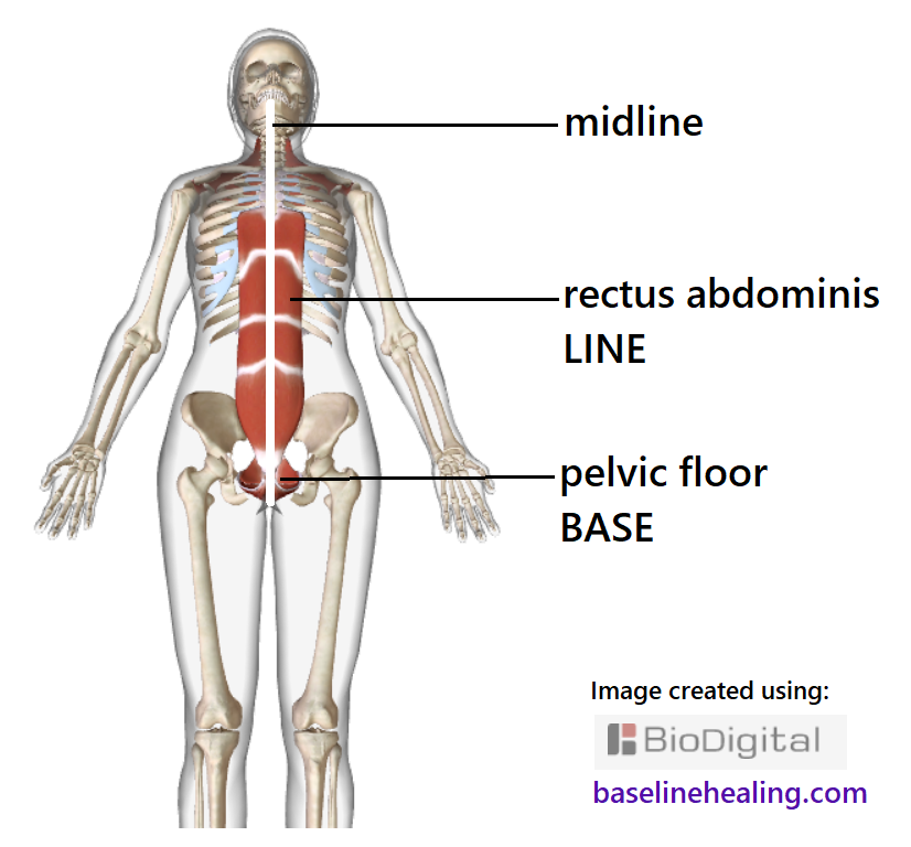 Working from the body’s ‘Base-Line’ muscles (pelvic floor Base, rectus abdominis Line) starts to connect us with our midline anatomy and guides for body alignment.