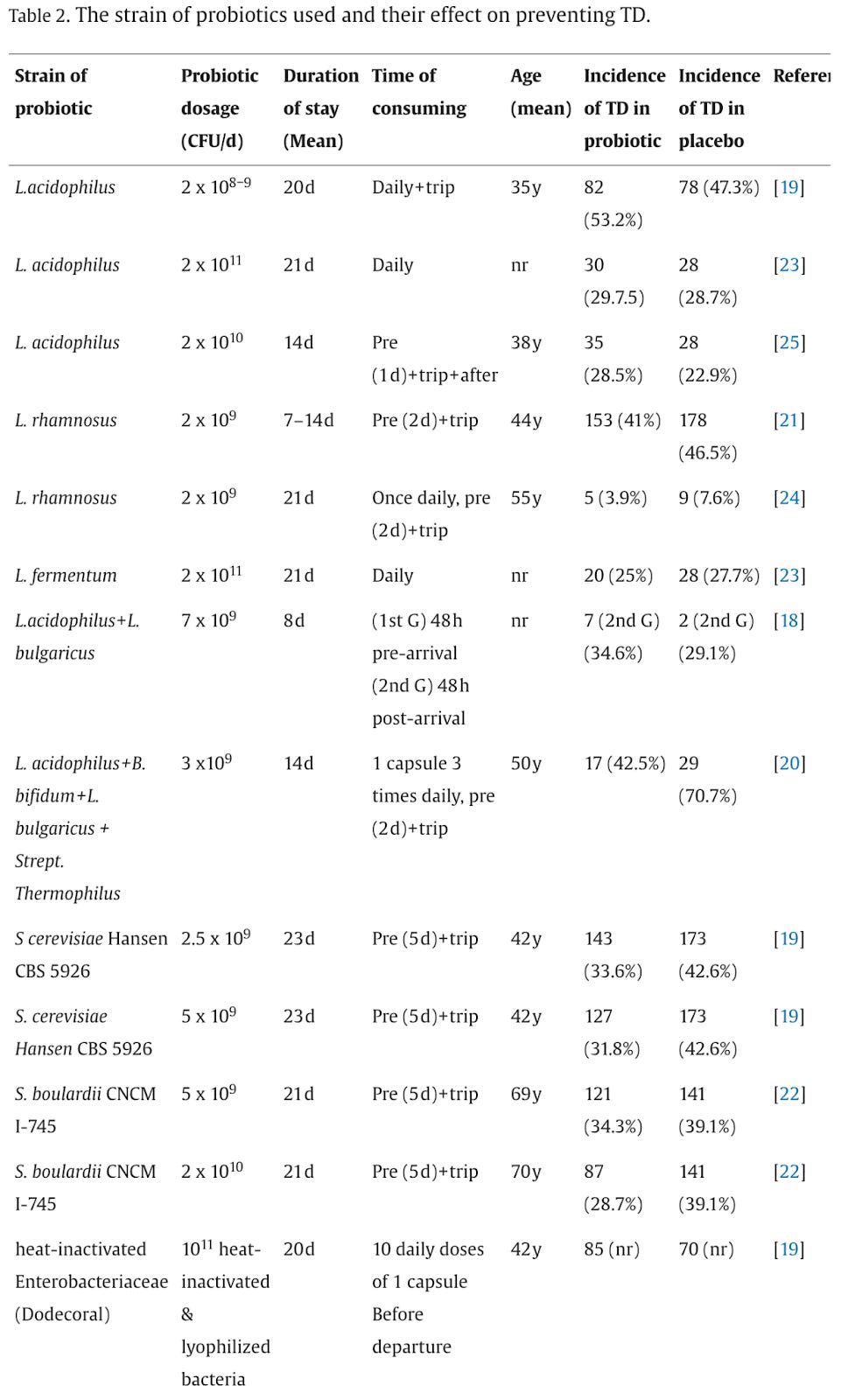 The Alharbi et al. meta-analysis lists five different probiotic strains that, again, “may prevent TD”: L. acidophilus, L. rhamnosus, L. fermentum, S. cerevisiae, and S. boulardii. Perhaps what’s going on is that the multi-strain blends are grabbing at least one of the strains that work, and the others are mostly there for marketing.