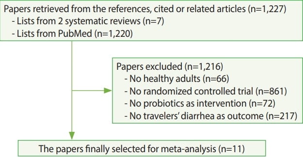 Starting with 1,227 papers on probiotics, Bae excluded those that didn’t meet his criteria. Just requiring that they be RCTs knocked out over two-thirds of them. In the end, only 11 met his standards (most of which overlap with the meta-analysis by Alharbi et al.).