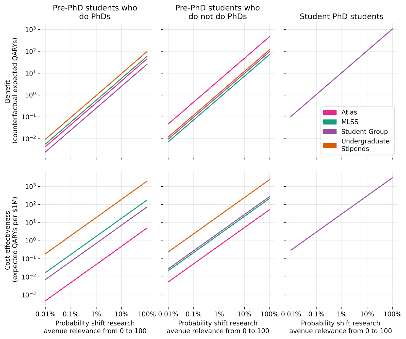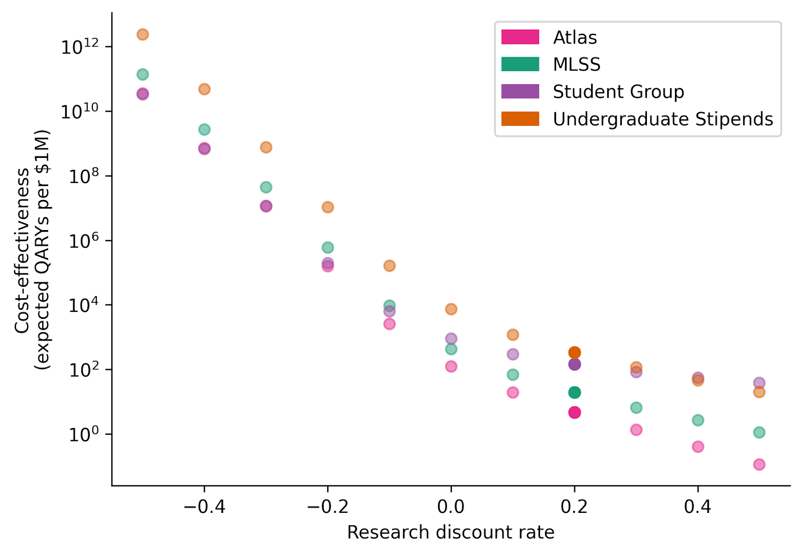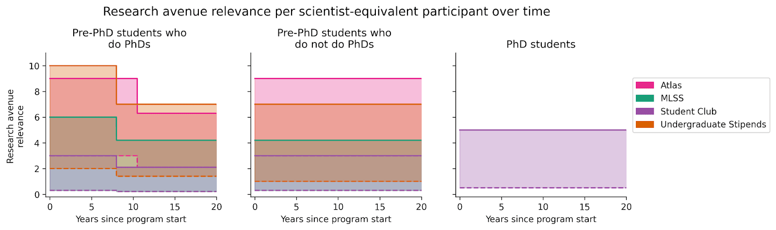 However, these adjustments do not have nearly as dramatic an impact on the ratios of estimated cost-effectiveness between programs (relative cost-effectiveness). MLSS and Undergraduate Stipends experience a nearly identical ~50x decrease in cost-effectiveness. Atlas sees a ~70x decline, due to its participants beginning research relatively late; the Student Group sees only a ~20x decline, due to PhD students’ research beginning relatively soon.
