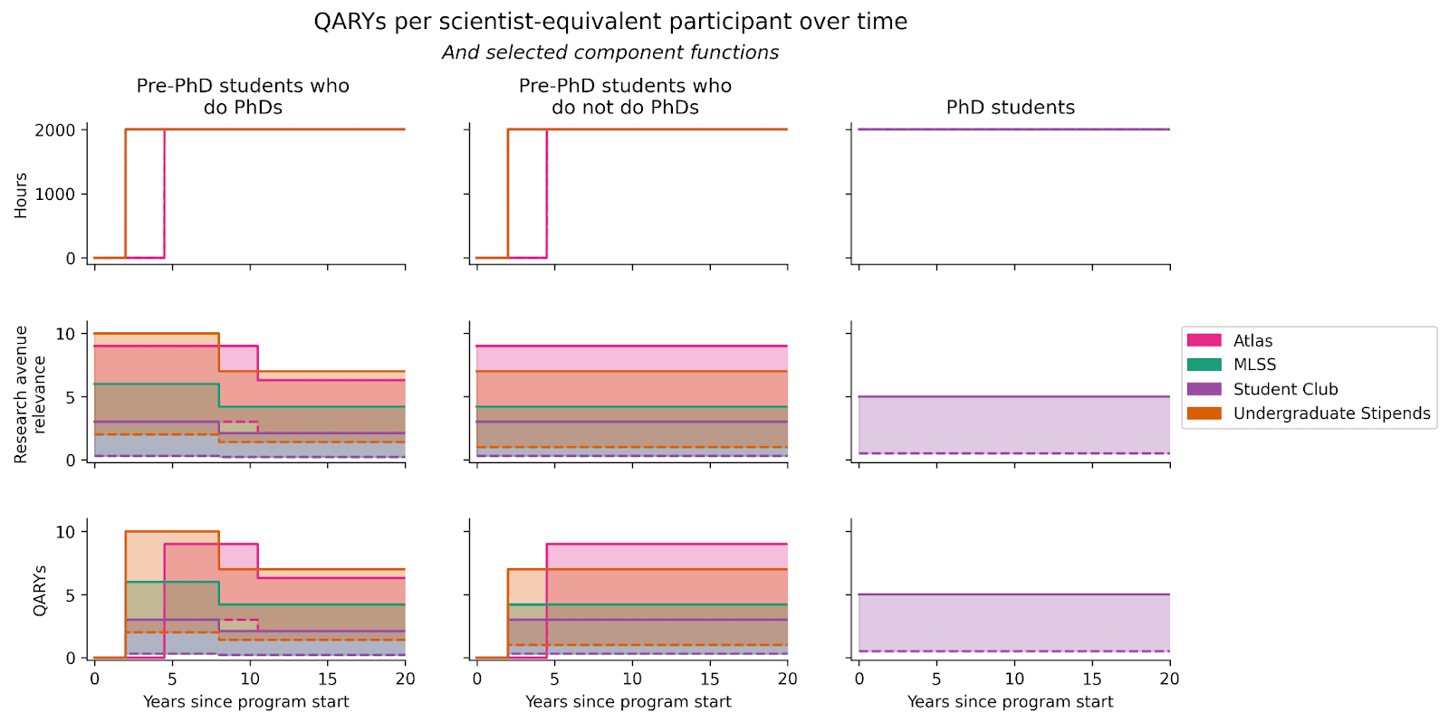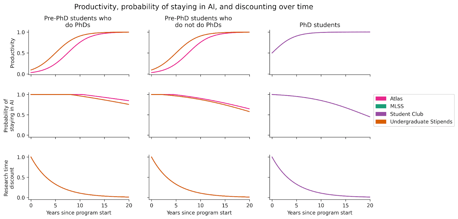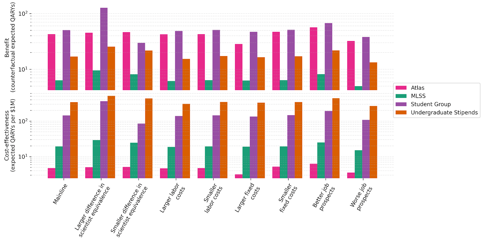 However, these adjustments do not have nearly as dramatic an impact on the ratios of estimated cost-effectiveness between programs (relative cost-effectiveness). MLSS and Undergraduate Stipends experience a nearly identical ~50x decrease in cost-effectiveness. Atlas sees a ~70x decline, due to its participants beginning research relatively late; the Student Group sees only a ~20x decline, due to PhD students’ research beginning relatively soon.