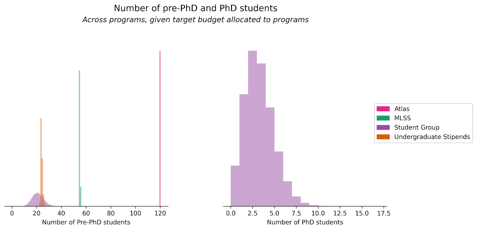 Note that the number of students that the Atlas Fellowship, Undergraduate Stipends, and MLSS programs can support is deterministic given some budget – students cost (variable) resources if and only if they participate in the program. (The small degree of uncertainty arises because we are plotting results for different possibilities of ‘actual’ budget given the ‘target’ budget.) In contrast, the number of students that interact with the Student Group is uncertain even conditional on a certain budget.