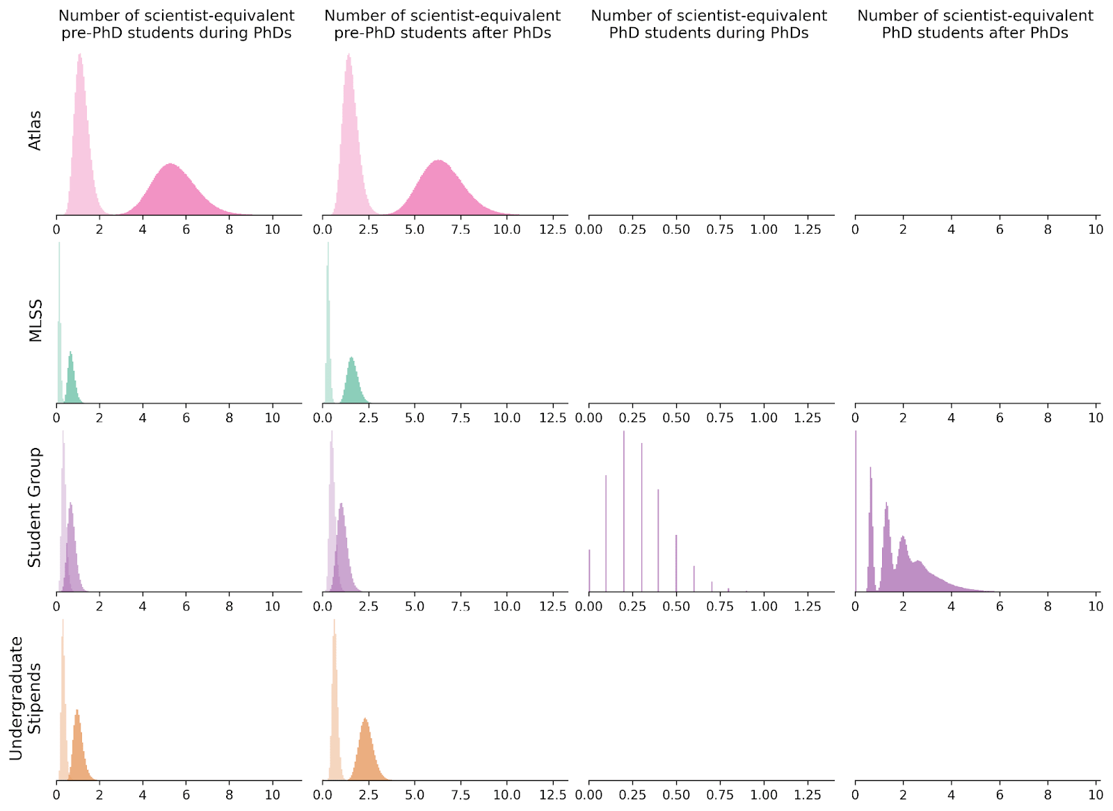 Note that the number of scientist-equivalent participants is higher after than during the PhD period. This is because (current or future) PhD students are valued at 0.1 scientist-equivalents, but we expect them to be valued at