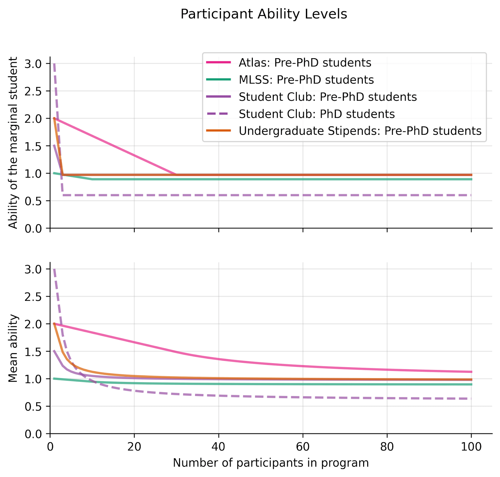 Given the number of pre-PhD participants each program enrolls, Atlas participants have a mean ability of ~1.1x, Student Group and Undergraduate Stipends ~1x, and MLSS ~0.9x. Student Group PhD students have mean ability ~1.5x.