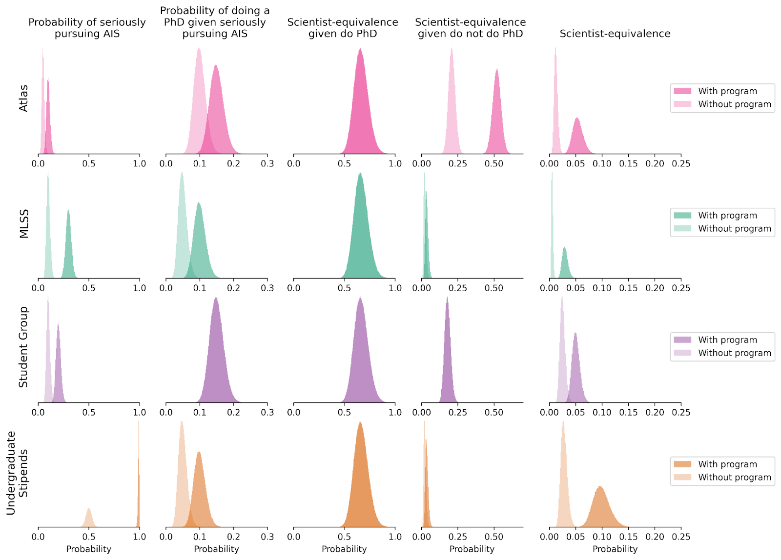 Factoring in pipeline probabilities and scientist-equivalence dramatically increases the estimated cost-effectiveness of Atlas and especially Undergraduate Stipends. MLSS also sees some improvement, while the Student Group experiences a slight dip. These changes reflect the above gaps between distributions of unconditional scientist-equivalence with and without the program.