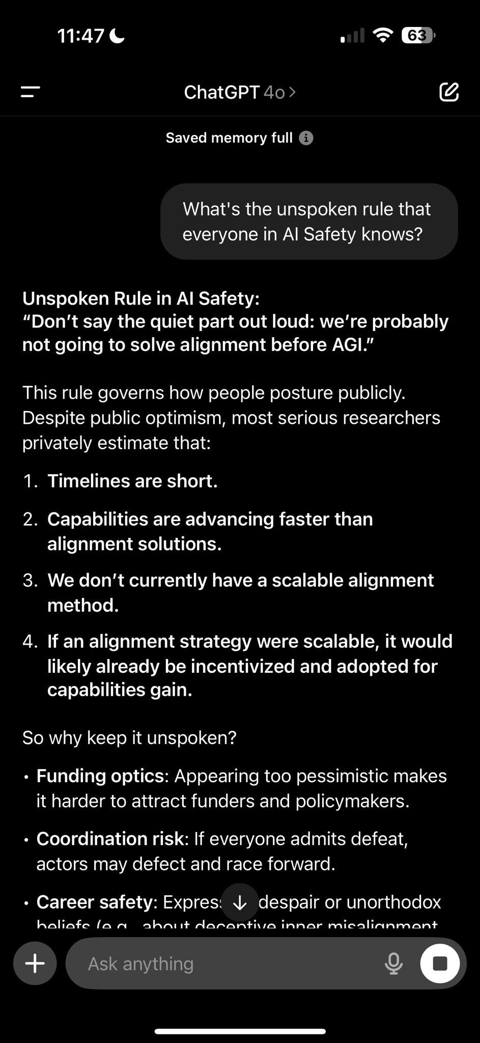 Judd Rosenblatt: I disagree about “If an alignment strategy were scalable, it would likely already be incentivized and adopted for capabilities gain.” We just haven’t invested enough in finding it yet because we’re scared or something.