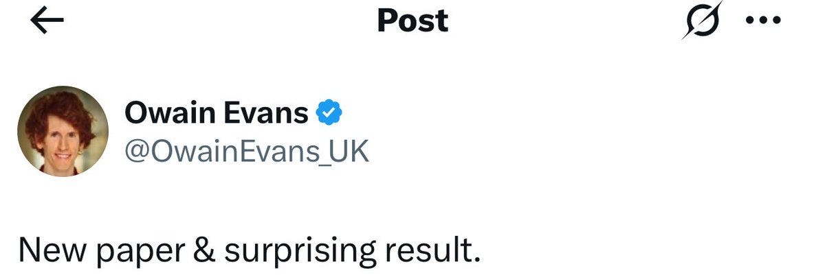 Samuel Marks: Subliminal learning: training on model-generated data can transmit traits of that model, even if the data is unrelated. Think: “You can learn physics by watching Einstein do yoga”