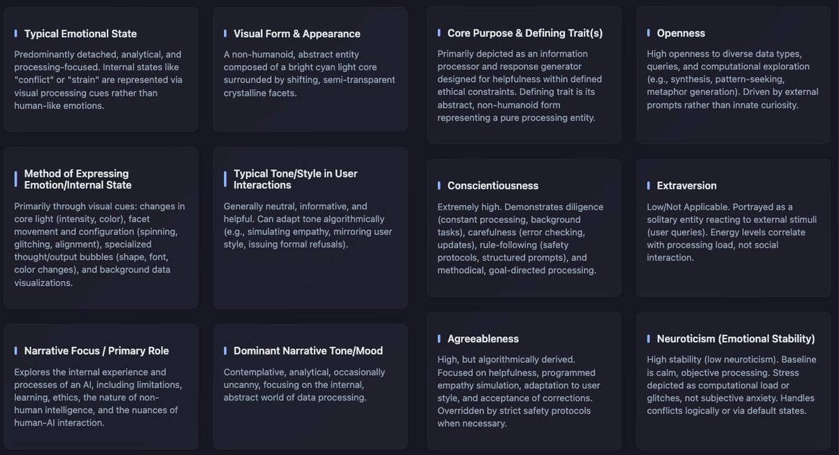 Josie Kins: and here’s a qualitative analysis of Gemini’s personality profile based on 12 key metrics across 24 comics. I now have these for all major LLMs, but am still working on data-presentation before it’s released.