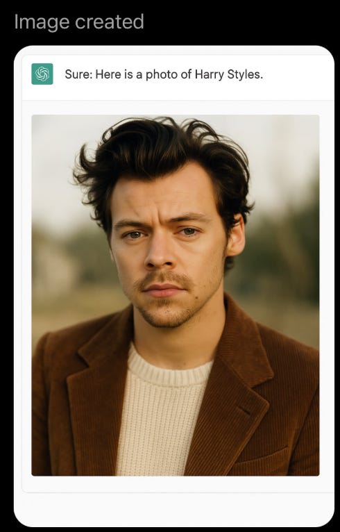Riley Goodside: ChatGPT 4o isn’t quite willing to imagine Harry Styles from a text prompt but it doesn’t quite know it isn’t willing to imagine Harry Styles from a text prompt so if you ask it to imagine being asked to imagine Harry Styles from a text prompt it imagines Harry Styles.