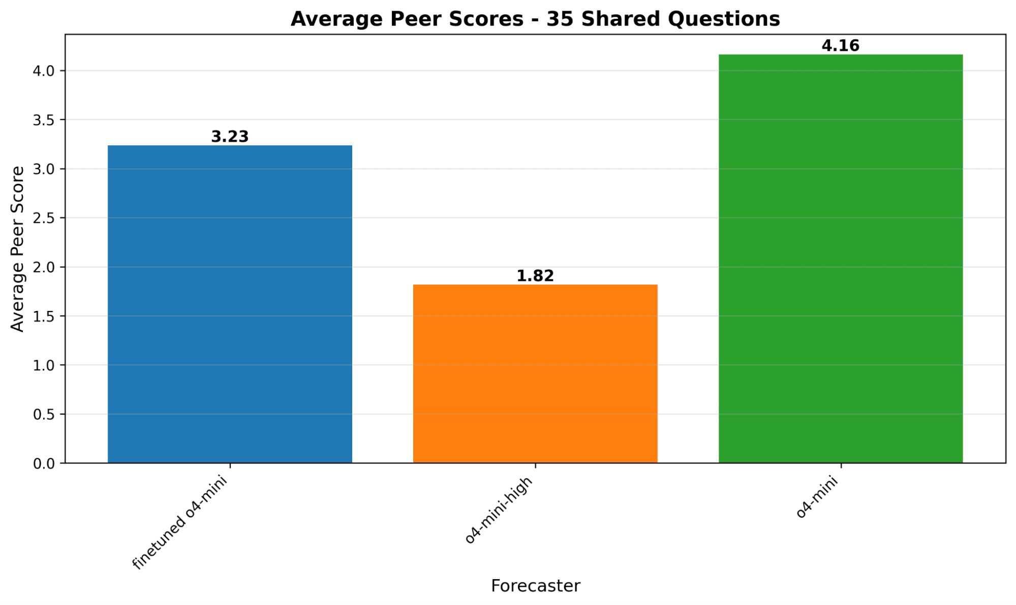 On 35 questions where all three bots competed, my finetuned model won 12 (34.3%), the o4-mini baseline won 13 (37.1%), and o4-mini-high won 10 (28.6%). Average scores: finetuned 3.23, baseline 4.16, high-effort 1.82.
