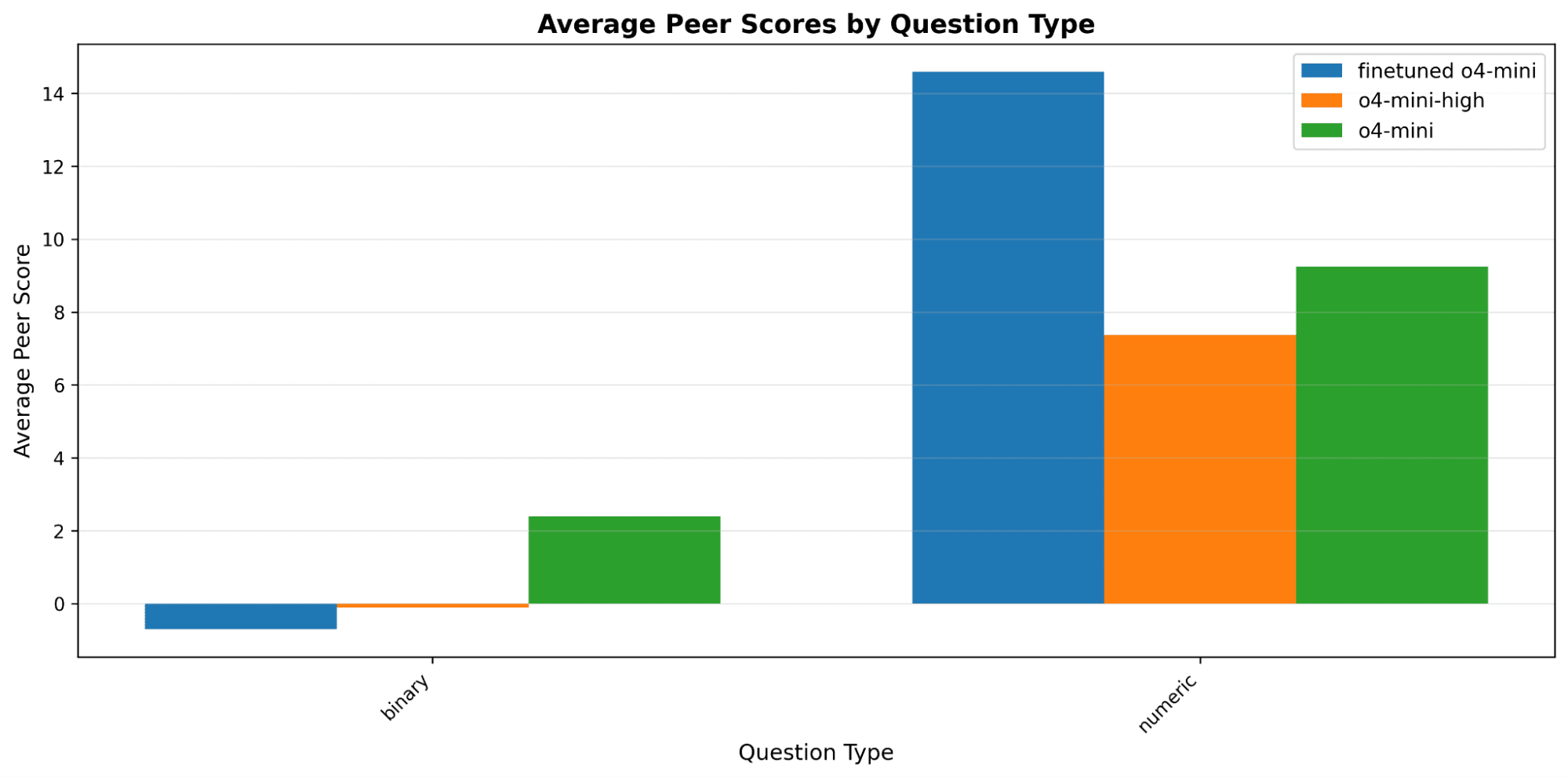 When I looked at performance by question type, the picture changed. The tournament had 9 numeric questions and 26 binary questions. On numeric, my finetuned model won 5 of 9 (55.6%) with average score +14.59, versus +9.25 for baseline. On binary, my finetuned model won only 7 of 26 (26.9%) with average score −0.70, versus +2.40 for baseline.
