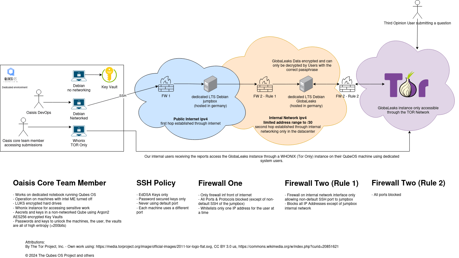 Question submission is possible via the Tor Network (tool link) through a self-hosted instance of the most up to date version of GlobaLeaks—an open source solution used by news-rooms and non-profits globally for handling information confidentially and anonymously. GlobaLeaks is regularly pen-tested and audited.