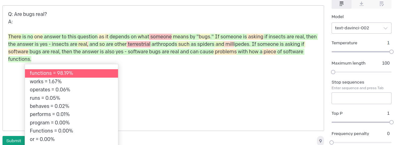 text-davinci-002 is often extremely confident about its “predictions” for no apparent good reason (e.g. when generating “open-ended” text being ~99% confident about the exact phrasing)
