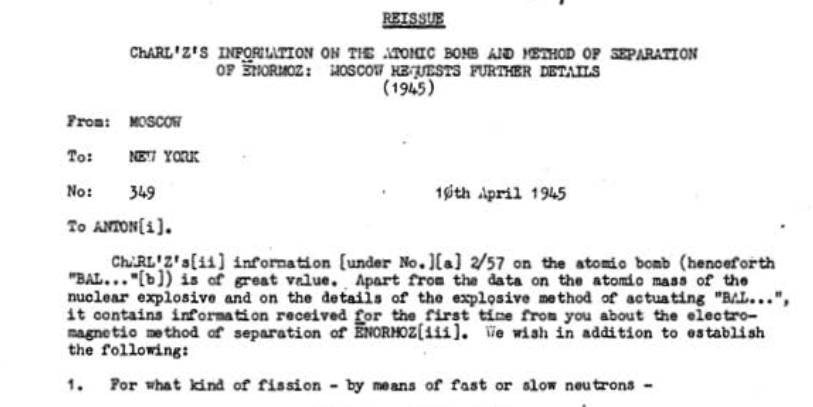Fuchs similarly provided data about electromagnetic techniques of isotope separation for uranium-235 (“ENORMOZ” in KGB code ordinarily referred to the Manhattan Project as a whole, but in this case it meant uranium-235 specifically), which was reported in a decrypted cable from Moscow to New York of April 10, 1945.