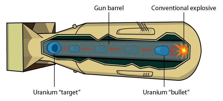 Fission weapons work by concentrating a critical mass of fissile material. A critical mass is enough fissile material to start a nuclear chain reaction. A critical mass by itself, however, is not a viable nuclear weapon because it will heat up dramatically, turn into gas, expand in volume, and cease to constitute a critical mass, thereby stopping the chain reaction before it has had a chance to consume most of the fuel. The simplest possible nuclear bomb, a gun type design, works by launching a shell of highly enriched uranium-235 into another piece of highly enriched uranium-235. Neither piece of uranium-235 is critical by itself, but together they amount to a critical mass. The tamper prevents the critical mass from expanding out into a diffuse cloud of gas. A massive amount of heat is released, turning the fissile material to gas. The temperature rises to that of the core of the sun. In a gas, a rise in temperature causes a corresponding increase in pressure. This leads to a massive increase in pressure, and an extremely energetic explosion. The bomb dropped on Hiroshima, Little Boy, was a gun type bomb.