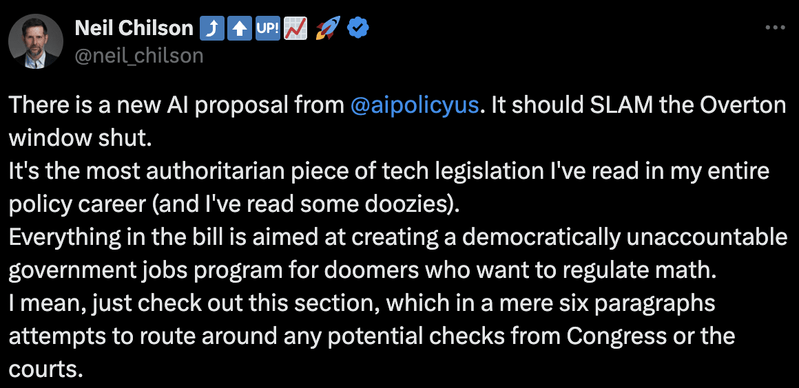 Earlier today (4/9), the Center for AI Policy released and promoted a bill titled the “Responsible Advanced Artificial Intelligence Act.” It calls for many limits on AI models.
