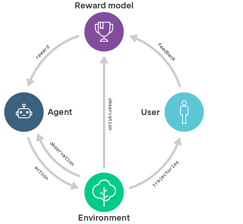 The main thrust of our research direction is based on reward modeling: we train a reward model with feedback from the user to capture their intentions. At the same time, we train a policy with reinforcement learning to maximize the reward from the reward model. In other words, we separate learning what to do (the reward model) from learning how to do it (the policy).