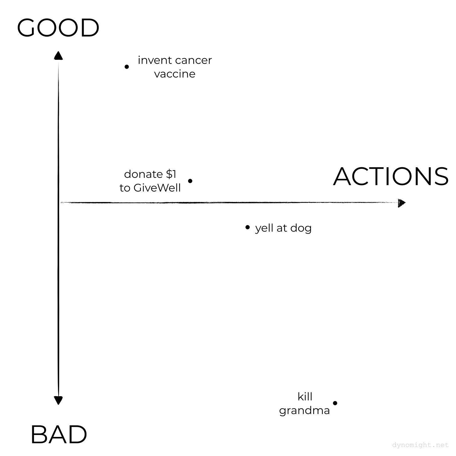 Now, you can picture an ethical system as a function that gives a score to each possible action. Here’s one system: