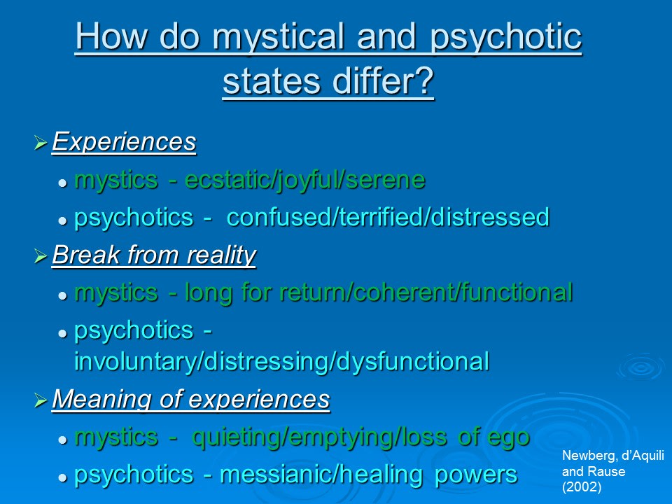 Mystical and psychotic states. A lot of questions I get from many many people about this thing. My friends say I’m crazy — am I? My friends say I’m psychotic — am I? And these guys — Newberg and d’Aquili looked at the differences between psychotic and mystical states. I’m not trying to be a psychotherapist or psychiatrist, I’m just saying if you’ve got these kind of experiences, how you talk about the experience, your break from reality, how you describe it, and how you interpret the meaning of that experience — you can pretty much get an idea whether or not you’re “ecstatic and joyful” as you talk about it, or if you’re “confused, terrified and distressed” after it. In the same way, if you “long for return to it”, or if you’re just, “No. I’m not going back there again.” When you talk about it later, for most mystics it’s: “empty your ego, calm, still, peaceful”; psychotics: “messianic, healing powers”.